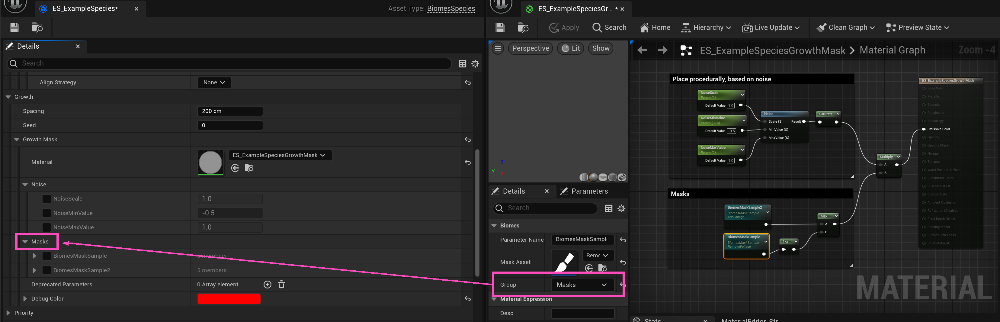 - We now automatically find parameters used inside material functions and Errant Biomes nodes and display them in UI, divided into sub-sections named after each Group.