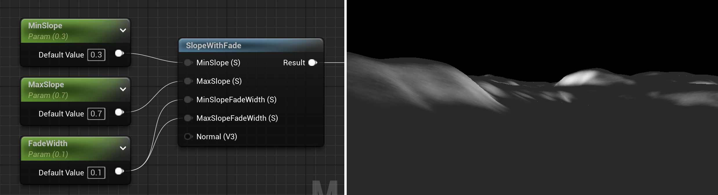 SlopeWithFadematerial function that allows fading out the transition between flat and sloped terrain in the Species/Sub-biome material masks.